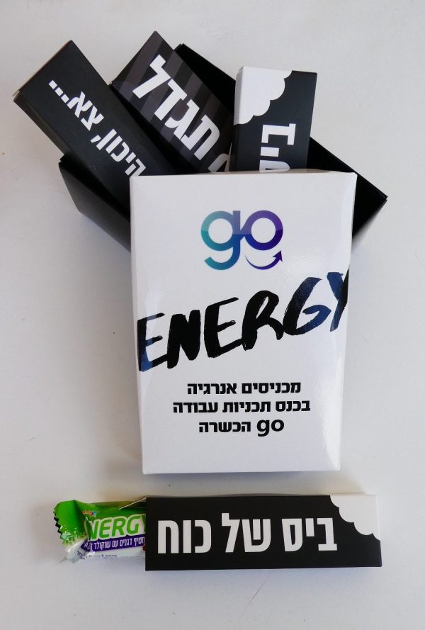 מארז חטיפי אנרגיה ממותגים עבור go הכשרה . מצויין להעברת מסרים..